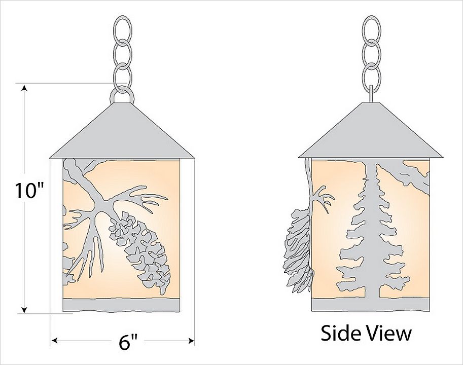 The Cascade Pendant Small - Spruce Cone features our exclusive spruce cone art on the front and back, with spruce trees on either side of the round cylinder. Diffuser choice between Almond or Amber mica. Includes a round ceiling canopy that can be mounted on either a flat or vaulted ceiling. Choice of three ways to hang our pendants: 14 ft black cord, 15 to 27 inch adjustable stem or 3 feet of chain. Black cord or chain hung versions are suitable for interior and damp locations; adjustable stem hung version are also suitable for wet locations. Hanging choice must be specified at time order. Note: Only the Powder Coated Finishes are suitable for wet locations. This rustic pendant is ideal for anyone looking for a small hanging light to add rustic character to their log home, cabin or northwoods lodge-themed room. Includes a round ceiling canopy that can be mounted on either a flat or vaulted ceiling.