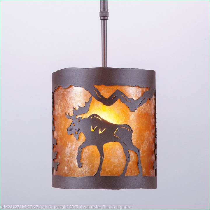 The Kincaid Pendant Small - Mtn Moose features our exclusive moose art on the front and back, with spruce trees on either side of the round cylinder. Diffuser choice between Almond or Amber mica, with an open top and bottom. Includes a round ceiling canopy that can be mounted on either a flat or vaulted ceiling. Choice of three ways to hang our pendants: 14 ft black cord, 15 to 27 inch adjustable stem or 3 feet of chain. Hanging choice must be specified at time order. This rustic pendant is ideal for anyone looking for a small hanging light to add rustic character to their log home, cabin or northwoods lodge-themed room. Includes a round ceiling canopy that can be mounted on either a flat or vaulted ceiling.