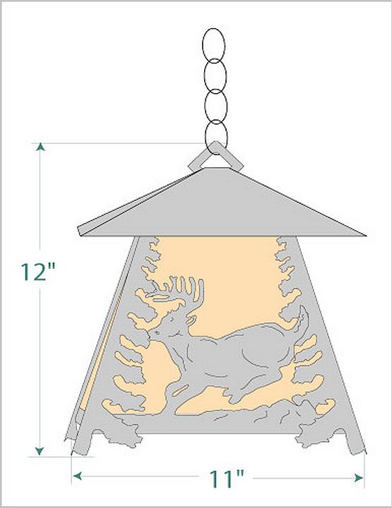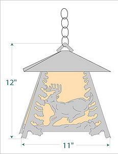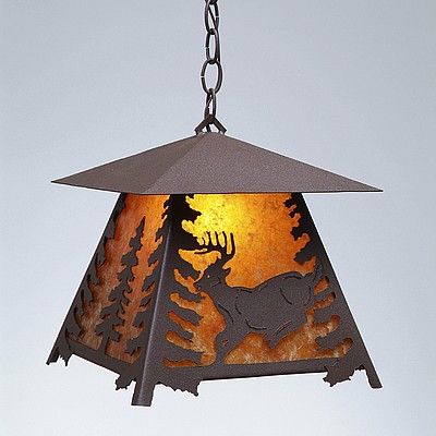 The Smoky Mtn Pendant Large - Mtn Deer features a deer image on the two front panels, along with a single spruce tree on the side panels. The fixture has a steel frame, and comes with a diffuser material choice between Almond or Amber mica. Included is a square ceiling canopy that can be mounted on either a flat or vaulted ceiling. You can choose from the following three hanging choices: a 14 ft black cord (BC), a 15in.-30in. adjustable stem (ST), or 3' of chain (CH). The black cord and chain-hung versions are suitable for interior and damp locations, and the adjustable stem-hung version is suitable for wet locations. This small hanging light will add a rustic character to any log home, cabin, or northwoods lodge-themed room.