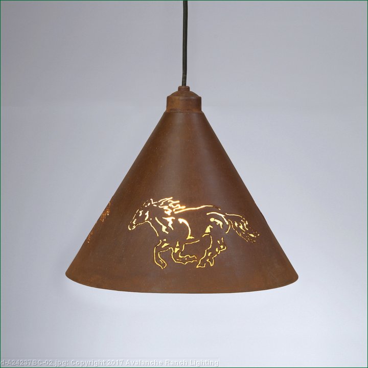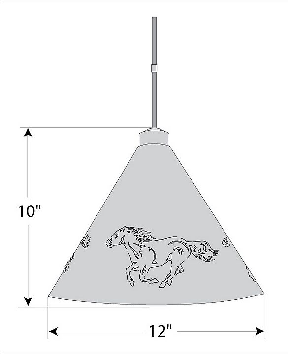 The Canyon Pendant Medium - Horse Cutouts features a heavy gauge spun steel cone with three, hand-cut horse around the cone. This light is ideal for anyone looking for a small hanging light to add rustic character to their log home, cabin or northwoods lodge-themed room. All pendants include a matching ceiling canopy that can be mounted on either a flat or vaulted ceiling. Choice of three ways to hang our pendants: 14 ft black cord (BC), 15 inch - 30in adjustable stem (ST) or 3 ft chain (CH). Black cord or chain hung versions are suitable for interior and damp locations; adjustable stem hung version are suitable for wet locations. Note: Only the Powder Coated Finishes are suitable for wet locations. Hanging choice must be specified at time order.