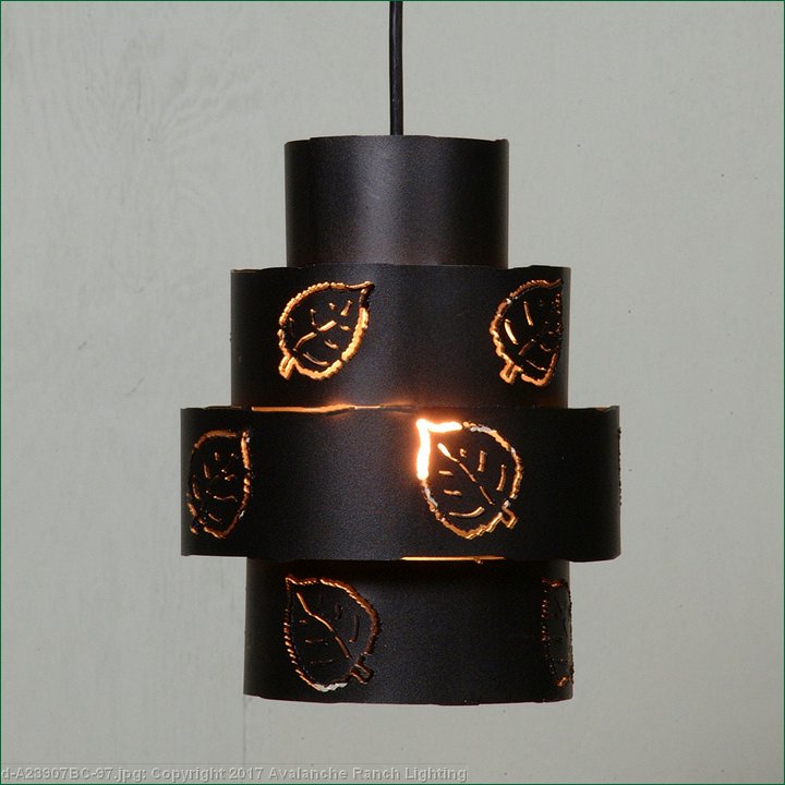 The Northridge Pendant is a hanging light that features hand-cut images on the steel bands with a 4 inch glass shade under the bands. This is the Aspen Leaf image cutout version, which is ideal for anyone looking for a small hanging light to add rustic character to their log home, cabin or northwoods lodge-themed room. All pendants include a matching ceiling canopy that can be mounted on either a flat or vaulted ceiling. Choice of three ways to hang our pendants: 14 ft black cord (BC), 15 inch - 30in adjustable stem (ST) or 3 ft chain (CH). Black cord or chain hung versions are suitable for interior and damp locations; adjustable stem hung version are suitable for wet locations. Hanging choice must be specified at time order choice.