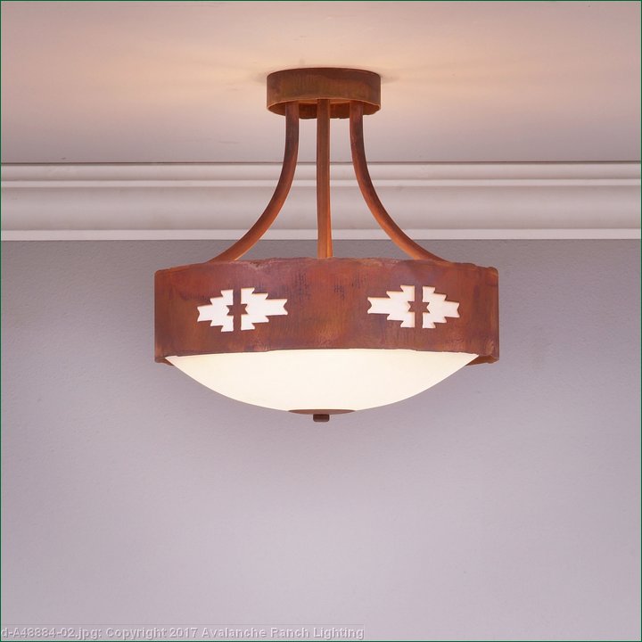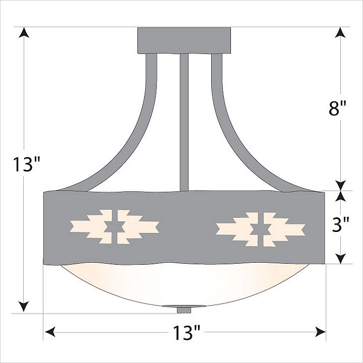 The Ridgemont Semi-Flush Medium - Pueblo is 13 inches in diameter, 13 inches high and and features our exclusive southwest pueblo art cutouts around the circumference of a steel band. Behind each cutout is a diffuser panel. The frosted glass bottom bowl detaches for bulb changing. For an unique addition to your rustic ceiling light, order one of the decorative Bottom Kits: a three-tree, 3D Spruce Cone or a 3D Pine Cone, any which can be ordered in the same or different color as the fixture. This Southwest-inspired design is ideal for anyone wanting a small chandelier to add rustic, Southwestern character to the entryway of their log home, cabin or northwood lodge-themed room.
