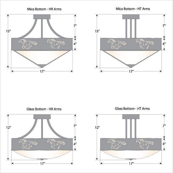 The Ridgemont Semi-Flush Large Short - Horse Cutout is 17 inches in diameter, 13 to 15 inches tall and features our exclusive horse art arranged around the circumference of a steel band. This rustic semi-flush fixture comes with a choice of bottom diffuser material: Almond Mica, Amber Mica or Ivory Paper. A matching ceiling canopy is also included. For an unique addition to your rustic ceiling light, order one of the decorative Bottom Kits: a three-tree, 3D Spruce Cone or a 3D Pine Cone, any which can be ordered in the same or different color as the fixture. This Western-inspired design is ideal for anyone wanting a small ceiling light to add rustic, western character to the hallways, kitchens or bathroom of their log home, cabin or northwood lodge-themed room.