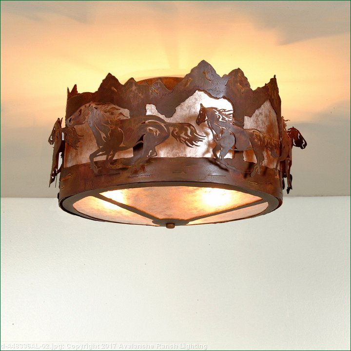 The Woodcrest Semi-flush - Horse/Mountain light is 17 inches in diameter, 10 inches tall and and features a steel band with galloping horses set in front of steel mountain silhouettes which is backed with matching diffuser material. For the bottom, there is a choice between frosted glass or mica with a choice of color between Almond or Amber. For an unique addition to your rustic ceiling light, order one of the decorative Bottom Kits: a three-tree, 3D Spruce Cone or a 3D Pine Cone, any which can be ordered in the same or different color as the fixture. This item is ideal for anyone looking for a rustic semi-flush light to add rustic, lodge character to their log home, cabin or northwood lodge-themed room.