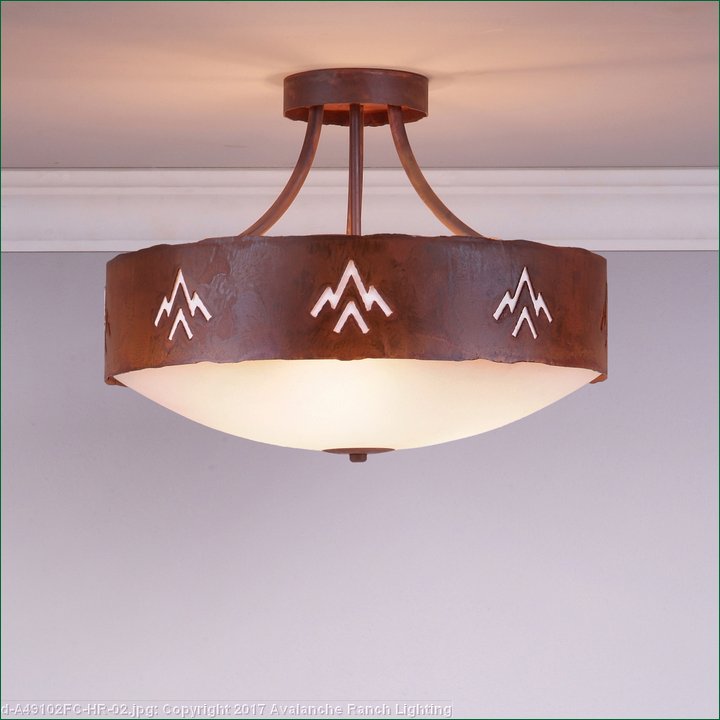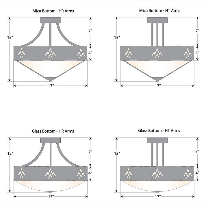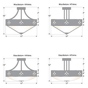 The Ridgemont Semi-Flush Large Short - Deception Pass is 17 inches in diameter, 13 to 15 inches tall and features our exclusive southwest art arranged around the circumference of a steel band. This rustic semi-flush fixture comes with a choice of colors for the glass bottom between a frosted glass bowl (FC) or Frosted Tea Stain (TS). A matching ceiling canopy is also included. For an unique addition to your rustic ceiling light, order one of the decorative Bottom Kits: a three-tree, 3D Spruce Cone or a 3D Pine Cone, any which can be ordered in the same or different color as the fixture. This Southwest-inspired design is ideal for anyone wanting a small ceiling light to add rustic, southwestern character to the hallways, kitchens or bathroom of their log home, cabin or northwood lodge-themed room.