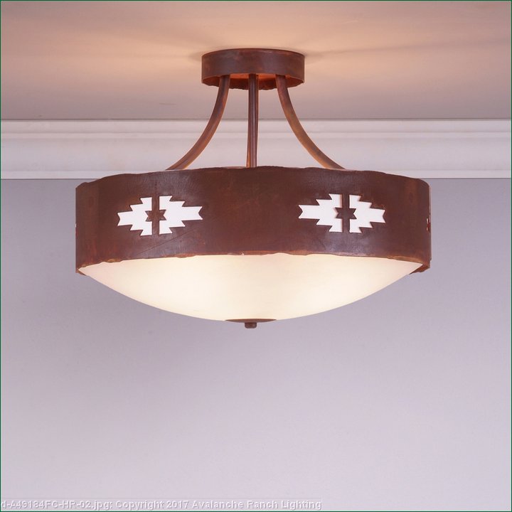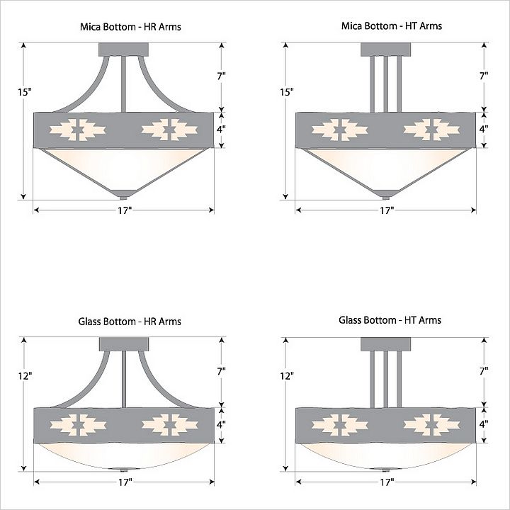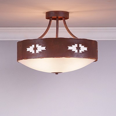 The Ridgemont Semi-Flush Large Short - Pueblo is 17 inches in diameter, 13 to 15 inches tall and features our exclusive southwest pueblo art arranged around the circumference of a steel band. This rustic semi-flush fixture comes with a choice of colors for the glass bottom between a frosted glass bowl (FC) or Frosted Tea Stain (TS). A matching ceiling canopy is also included. For an unique addition to your rustic ceiling light, order one of the decorative Bottom Kits: a three-tree, 3D Spruce Cone or a 3D Pine Cone, any which can be ordered in the same or different color as the fixture.This Southwest-inspired design is ideal for anyone wanting a small ceiling light to add rustic, southwestern character to the hallways, kitchens or bathroom of their log home, cabin or northwood lodge-themed room.