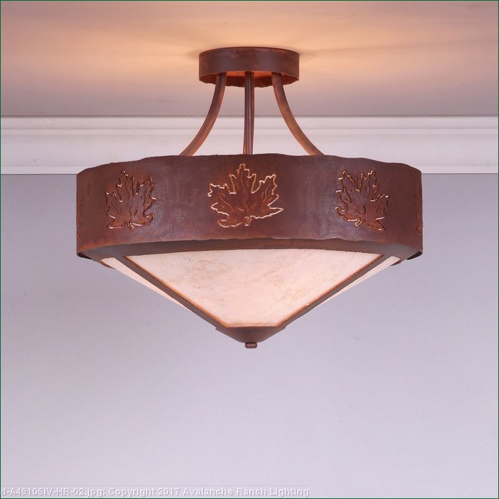 The Ridgemont Semi-Flush Large Short - Maple Cutout is 17 inches in diameter, 13 to 15 inches tall and features our exclusive maple leaf art arranged around the circumference of a steel band. This rustic semi-flush fixture comes with a choice of bottom diffuser material: Almond Mica, Amber Mica or Ivory Paper. A matching ceiling canopy is also included. For an unique addition to your rustic ceiling light, order one of the decorative Bottom Kits: a three-tree, 3D Spruce Cone or a 3D Pine Cone, any which can be ordered in the same or different color as the fixture. This Forest-inspired design is ideal for anyone wanting a small ceiling light to add rustic, Northwoods character to the hallways, kitchens or bathroom of their log home, cabin or northwood lodge-themed room.