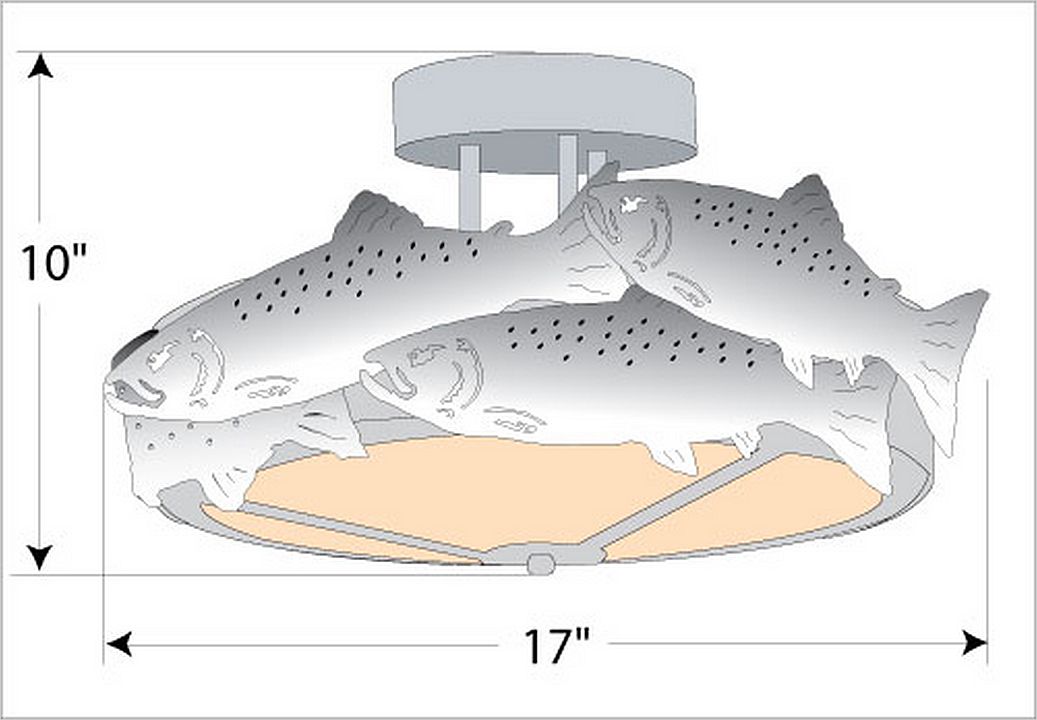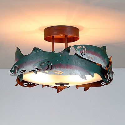 The Woodcrest Semi-flush - Trout light is 17 inches in diameter, 10 inches tall and our unique seven-step hand-painted finishing process with steel images of trout all around the band of the light. For the bottom, there is a choice between frosted glass or mica with a choice of color between Almond or Amber. For an unique addition to your rustic ceiling light, order one of the decorative Bottom Kits: a three-tree, 3D Spruce Cone or a 3D Pine Cone, any which can be ordered in the same or different color as the fixture. This item is ideal for anyone looking for a rustic semi-flush light to add rustic, lodge character to their log home, cabin or northwood lodge-themed room.