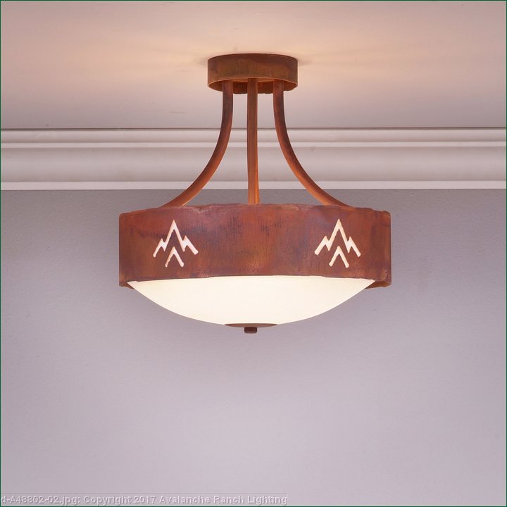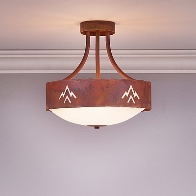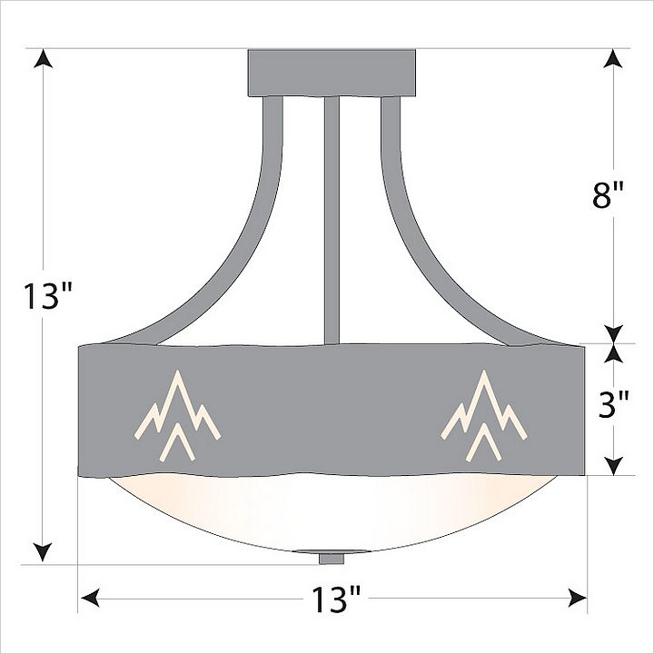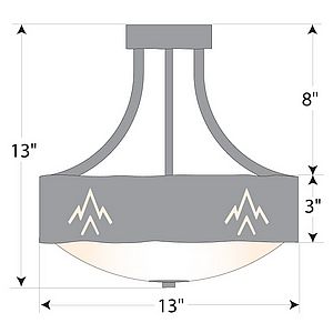 The Ridgemont Semi-Flush Medium - Deception Pass is 13 inches in diameter, 13 inches high and and features our exclusive southwest art cutouts around the circumference of a steel band. Behind each cutout is a diffuser panel. The frosted glass bottom bowl detaches for bulb changing. For an unique addition to your rustic ceiling light, order one of the decorative Bottom Kits: a three-tree, 3D Spruce Cone or a 3D Pine Cone, any which can be ordered in the same or different color as the fixture. This Southwest-inspired design is ideal for anyone wanting a small chandelier to add rustic, Southwestern character to the entryway of their log home, cabin or northwood lodge-themed room.