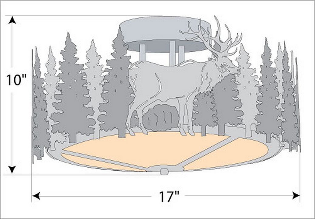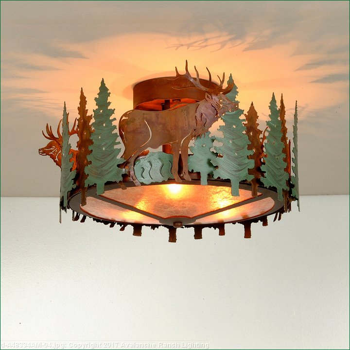 The Woodcrest Semi-flush - Elk light is 17 inches in diameter, 10 inches tall and and features our exclusive elk images nestled among the hand-painted pine trees around the circumference of a steel band. Behind each cutout is a diffuser panel. For the bottom, there is a choice between frosted glass or mica with a choice of color between Almond or Amber. For an unique addition to your rustic ceiling light, order one of the decorative Bottom Kits: a three-tree, 3D Spruce Cone or a 3D Pine Cone, any which can be ordered in the same or different color as the fixture. This item is ideal for anyone looking for a rustic semi-flush light to add rustic, lodge character to their log home, cabin or northwood lodge-themed room.
