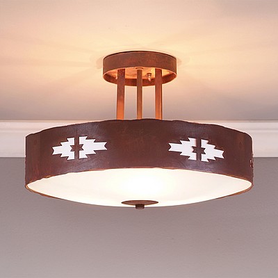 The Woodcrest Semi-flush - Pueblo light is 15 inches in diameter, 10 inches tall and features our exclusive southwest pueblo art cutouts around the circumference of a steel band. Behind each cutout is a diffuser panel.. For the bottom, there is a choice between frosted glass mo mica with a choice of color between Almond or Amber. For an unique addition to your rustic ceiling light, order one of the decorative Bottom Kits: a three-tree, 3D Spruce Cone or a 3D Pine Cone, any which can be ordered in the same or different color as the fixture. This item is ideal for anyone looking for a rustic semi-flush light to add rustic, Southwestern character to their log home, cabin or northwood lodge-themed room.