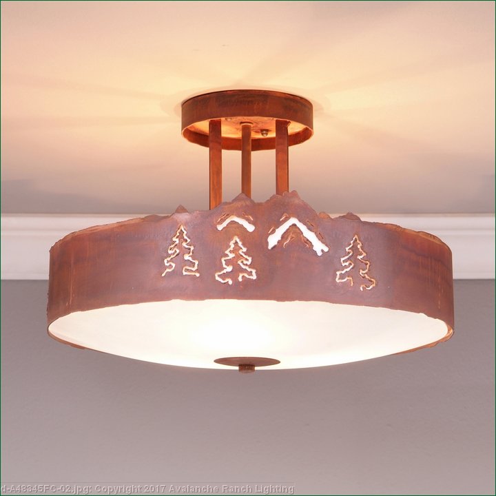 The Woodcrest Semi-flush - Mountain/Pine Cutout light is 15 inches in diameter, 10 inches tall and features our exclusive mountain and pine tree art cutouts around the circumference of a steel band. Behind each cutout is a diffuser panel. For the bottom, there is a choice between frosted glass or mica with a choice of color between Almond or Amber. For an unique addition to your rustic ceiling light, order one of the decorative Bottom Kits: a three-tree, 3D Spruce Cone or a 3D Pine Cone, any which can be ordered in the same or different color as the fixture. This item is ideal for anyone looking for a rustic semi-flush light to add rustic, lodge character to their log home, cabin or northwood lodge-themed room.
