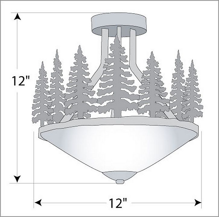 The Wisley Semi-Flush - Cedar Tree features steel cedar trees atop a steel band holding a frosted torcheire glass bowl that measures 12 inches wide by 3 inches high. This sophisticated yet rustic light will create a warm atmosphere in any log home, cabin or northwood lodge-themed room.