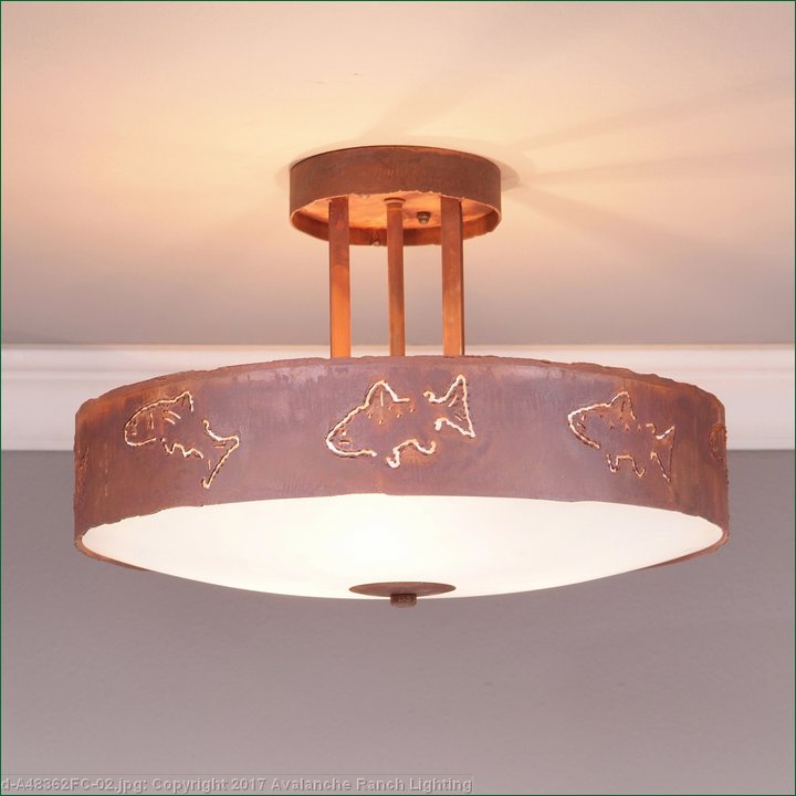 The Woodcrest Semi-flush - Fish Cutout light is 15 inches in diameter, 10 inches tall and features our exclusive salmon and trout art cutouts around the circumference of a steel band. Behind each cutout is a diffuser panel. For the bottom, there is a choice between frosted glass or mica with a choice of color between Almond or Amber. For an unique addition to your rustic ceiling light, order one of the decorative Bottom Kits: a three-tree, 3D Spruce Cone or a 3D Pine Cone, any which can be ordered in the same or different color as the fixture. This item is ideal for anyone looking for a rustic semi-flush light to add rustic, lodge character to their log home, cabin or northwood lodge-themed room.