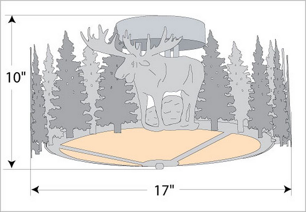 The Woodcrest Semi-flush - Moose light is 17 inches in diameter, 10 inches tall and and features our exclusive moose images nestled among the hand-painted pine trees around the circumference of a steel band. Behind each cutout is a diffuser panel. For the bottom, there is a choice between frosted glass or mica with a choice of color between Almond or Amber. For an unique addition to your rustic ceiling light, order one of the decorative Bottom Kits: a three-tree, 3D Spruce Cone or a 3D Pine Cone, any which can be ordered in the same or different color as the fixture. This item is ideal for anyone looking for a rustic semi-flush light to add rustic, lodge character to their log home, cabin or northwood lodge-themed room.