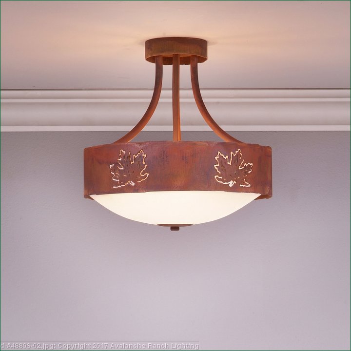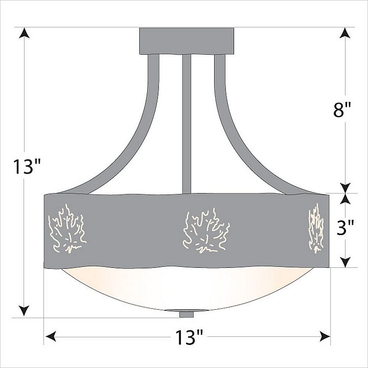 The Ridgemont Semi-Flush Medium - Maple Cutout is 13 inches in diameter, 13 inches high and features our exclusive maple leaf art cutouts around the circumference of a steel band. Behind each cutout is a diffuser panel. The frosted glass bottom bowl detaches for bulb changing. For an unique addition to your rustic ceiling light, order one of the decorative Bottom Kits: a three-tree, 3D Spruce Cone or a 3D Pine Cone, any which can be ordered in the same or different color as the fixture. This light, ideal for both high and low ceilings, gives off an air of rustic sophistication that will add warm lighting and character to any log home, cabin or northwood lodge-themed room.