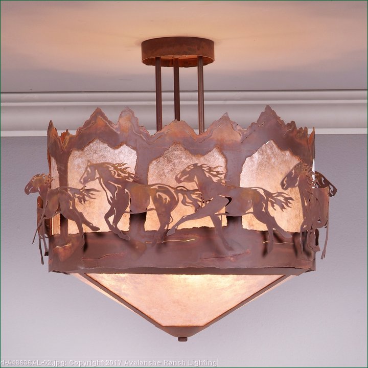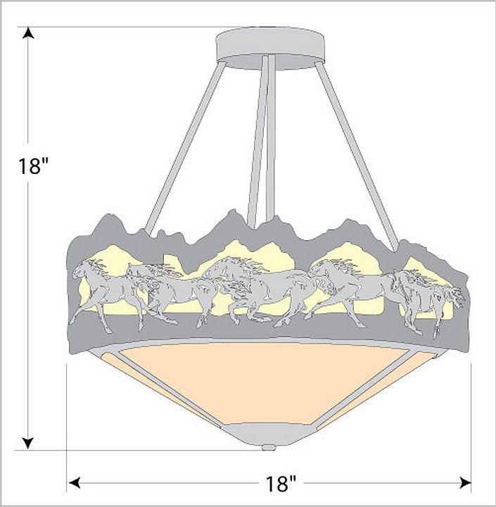 The Crestline Semi-Flush - Horse/Mountain is 18 inches in diameter by 18 inches tall, and features images of galloping horses and steel mountain silhouettes, backed with diffuser material. The fixture comes with a choice of diffuser material: Almond Mica, Amber Mica, or Ivory Paper. A matching ceiling canopy is also included. This wildlife-inspired semi-flush will add a rustic, western character to the hallways, kitchens or bathroom of their log home, tack room, cabin or northwood lodge-themed room.