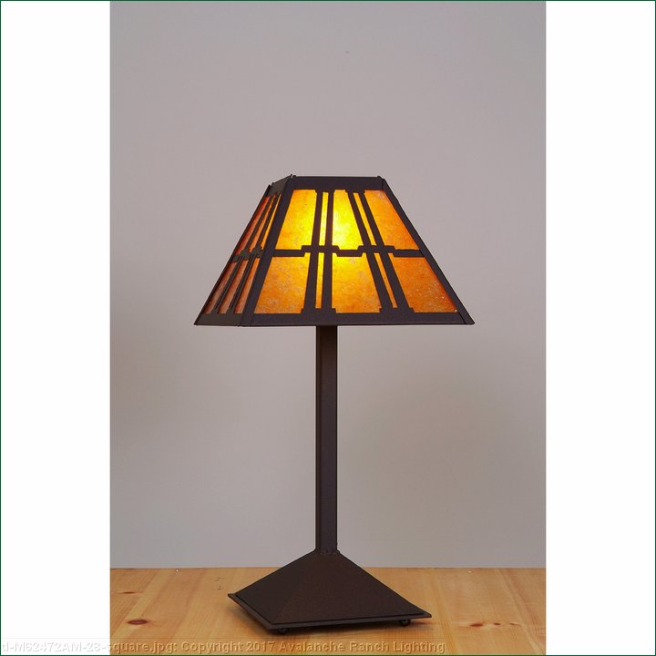 The Rocky Mtn Desk Lamp - Eastlake features a 12in. wide by 8in. tall lampshade frame with our exclusive mission-style artwork displayed on all four panels. The lamp is made of heavy gauge steel, and has a diffuser choice between Almond or Amber mica. The light features a simple stand with a square base, four molded vinyl feet on the bottom to protect the table surface, and a three-way switch built into the socket. This mission-styled desk lamp will bring warm character to any cottage, craftsman-styled room, or traditional home.