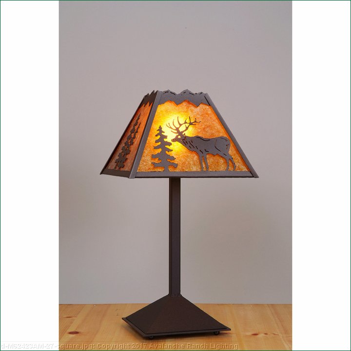 The Rocky Mtn Desk Lamp - Valley Elk features a 12in. wide by 8in. tall lampshade frame with our exclusive elk metal artwork on the front two panels, and spruce trees on the sides. The lamp is made of heavy gauge steel, and has a diffuser choice between Almond or Amber mica. The light features a simple stand with a square base, four molded vinyl feet on the bottom to protect the table surface, and a three-way switch built into the socket. This desk lamp will bring rustic, decorative lighting to any log home, cabin or northwood lodge-themed room.