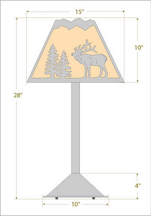 The Rocky Mtn Table Lamp - Mtn Elk features a 15in. wide by 10in. tall lampshade frame with our exclusive elk metal artwork on the front two panels, and spruce trees on the sides. The lamp is made of heavy gauge steel, and has a diffuser choice between Almond or Amber mica. The light features a simple stand with a square base, four molded vinyl feet on the bottom to protect the table surface, and a three-way switch built into the socket. This table lamp will bring rustic, decorative lighting to any log home, cabin or northwood lodge-themed room.