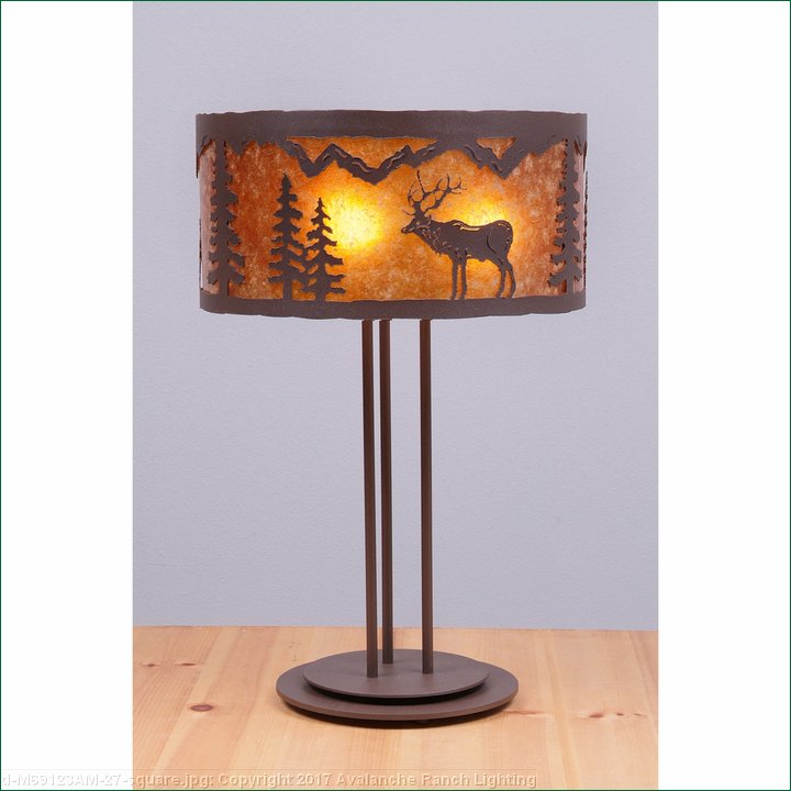 The Kincaid Drum Desk Lamp - Valley Elk features our exclusive elk and spruce tree metal art in three sections and all around the drum lampshade. The lampshade measures 17 inches in diameter by 8.5 inches tall, is made of heavy gauge steel and inside has a mica diffuser with a choice of either Almond or Amber. It has a simple stand with a round base and three molded vinyl feet on the bottom to protect the surface of the table and a dimmer switch. This rustic desk lamp will bring a rustic decorative look and lighting to any log home, cabin or northwood lodge-themed room.