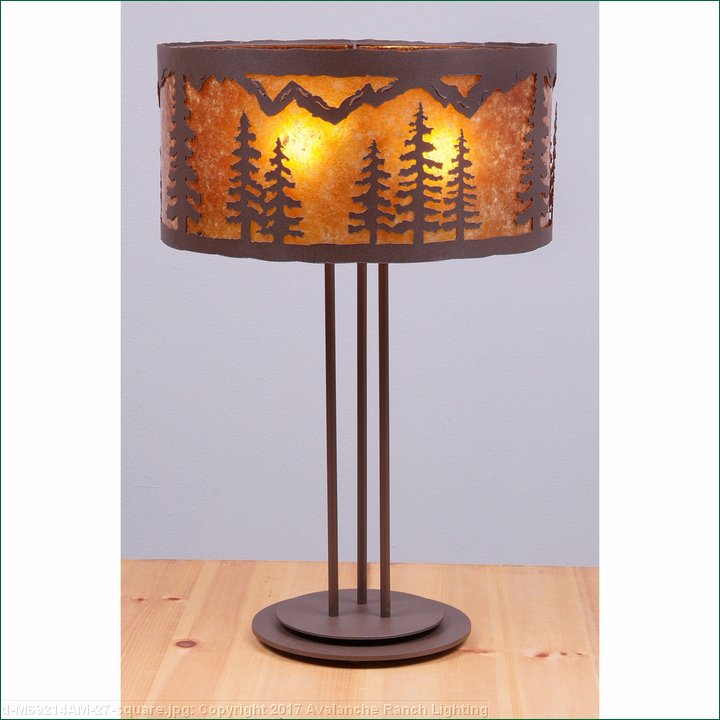 The Kincaid Drum Table Lamp - Spruce Tree features our exclusive spruce tree metal art on all four sides of the lampshade. The lampshade measures 19 inches in diameter by 9.5 inches tall, is made of heavy gauge steel and inside has a mica diffuser with a choice of either Almond or Amber. It has a simple stand with a round base and three molded vinyl feet on the bottom to protect the surface of the table and a dimmer switch. This rustic table lamp will bring a rustic decorative look and lighting to any log home, cabin or northwood lodge-themed room.