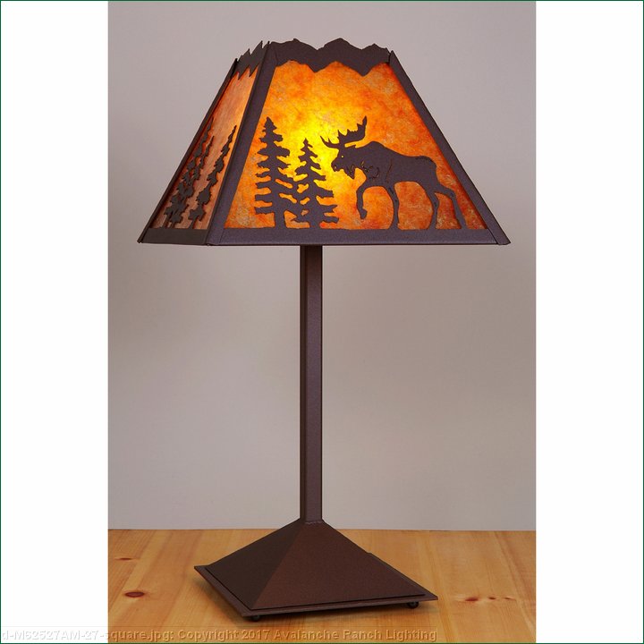 The Rocky Mtn Table Lamp - Mtn Moose features a 15in. wide by 10in. tall lampshade frame with our exclusive moose metal artwork on the front two panels, and spruce trees on the sides. The lamp is made of heavy gauge steel, and has a diffuser choice between Almond or Amber mica. The light features a simple stand with a square base, four molded vinyl feet on the bottom to protect the table surface, and a three-way switch built into the socket. This table lamp will bring rustic, decorative lighting to any log home, cabin or northwood lodge-themed room.