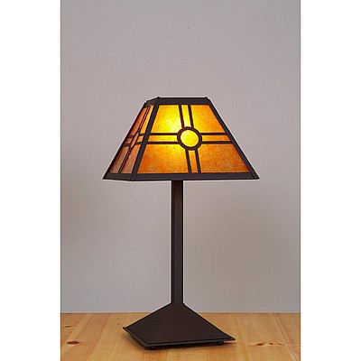The Rocky Mtn Desk Lamp - Southview features a 12in. wide by 8in. tall lampshade frame with our exclusive mission-style artwork displayed on all four panels. The lamp is made of heavy gauge steel, and has a diffuser choice between Almond or Amber mica. The light features a simple stand with a square base, four molded vinyl feet on the bottom to protect the table surface, and a three-way switch built into the socket. This mission-styled desk lamp will bring warm character to any cottage, craftsman-styled room, or traditional home.