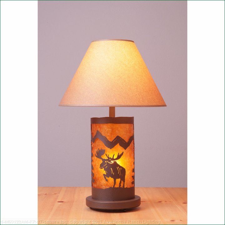 The Cascade Table Lamp - Alaska Moose stands about 29 inches tall and features our exclusive moose metal art on the front and a spruce tree on the back of the lamp. Spruce trees are also on each side. It has a round base with a shade material choice between Almond or Amber mica. The upper socket also has a 3-way switch, so that you can have just the base lit, just the upper lamp lit, or both lit. Lampshade (Item #730-KR) is sold separately. This rustic lamp is one of our most popular styles and will bring a rustic decorative touch to any log home, cabin or northwood lodge-themed room.