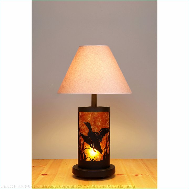 The Cascade Desk Lamp - Loon stands about 26 inches tall and features a loon on the front and cattail images on the back of the lamp. Solid bands are on each side. It has a round base with a shade material choice between Almond or Amber mica. The upper socket also has a 3-way switch, so that you can have just the base lit, just the upper lamp lit, or both lit. Lampshade (Item #720-KR) is sold separately. This lamp is one of our most popular styles and will bring rustic character to any log home, cabin or northwood lodge-themed room.