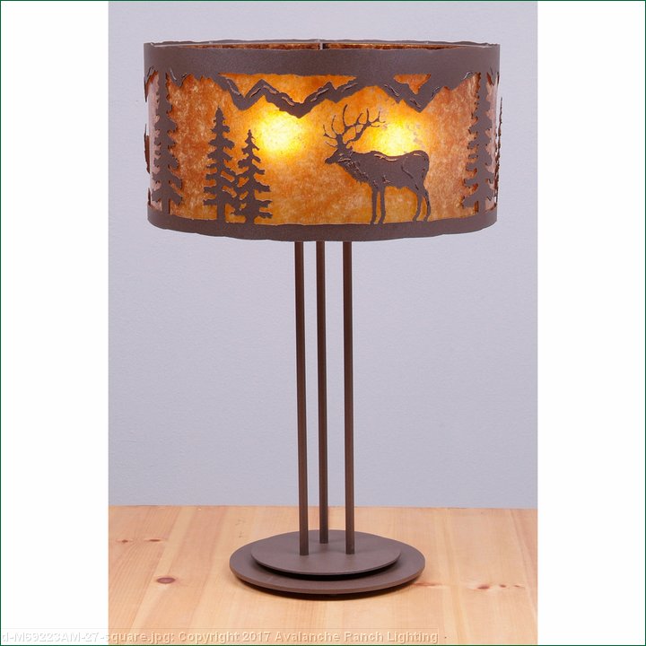 The Kincaid Drum Table Lamp - Valley Elk features our exclusive elk and spruce tree metal art in three sections and all around the drum lampshade. The lampshade measures 19 inches in diameter by 9.5 inches tall, is made of heavy gauge steel and inside has a mica diffuser with a choice of either Almond or Amber. It has a simple stand with a round base and three molded vinyl feet on the bottom to protect the surface of the table and a dimmer switch. This rustic table lamp will bring a rustic decorative look and lighting to any log home, cabin or northwood lodge-themed room.