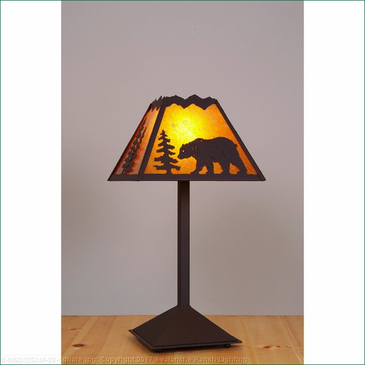 The Rocky Mtn Desk Lamp - Mtn Bear features a 12in. wide by 8in. tall lampshade frame with our exclusive bear metal artwork on the front two panels, and spruce trees on the sides. The lamp is made of heavy gauge steel, and has a diffuser choice between Almond or Amber mica. The light features a simple stand with a square base, four molded vinyl feet on the bottom to protect the table surface, and a three-way switch built into the socket. This desk lamp will bring rustic, decorative lighting to any log home, cabin or northwood lodge-themed room.