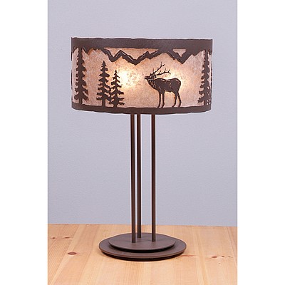 The Kincaid Drum Desk Lamp - Mtn Elk features our exclusive elk and spruce tree metal art in three sections and all around the drum lampshade. The lampshade measures 17 inches in diameter by 8.5 inches tall, is made of heavy gauge steel and inside has a mica diffuser with a choice of either Almond or Amber. It has a simple stand with a round base and three molded vinyl feet on the bottom to protect the surface of the table and a dimmer switch. This rustic desk lamp will bring a rustic decorative look and lighting to any log home, cabin or northwood lodge-themed room.