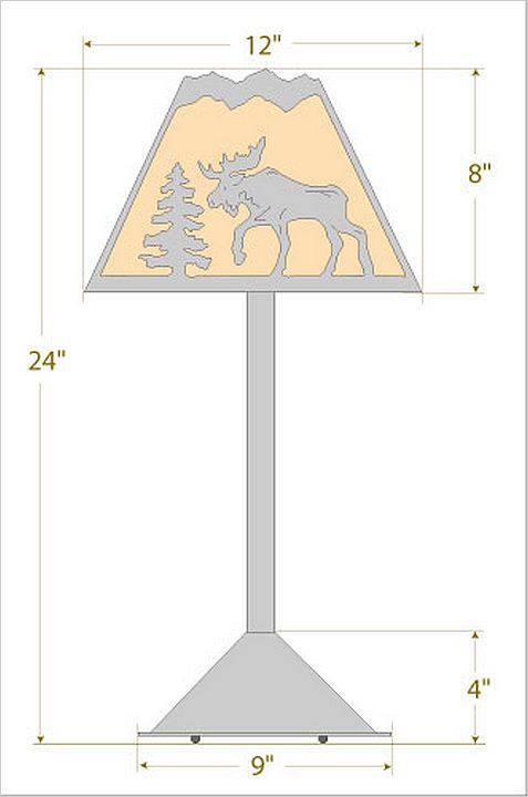 The Rocky Mtn Desk Lamp - Mtn Moose features a 12in. wide by 8in. tall lampshade frame with our exclusive moose metal artwork on the front two panels, and spruce trees on the sides. The lamp is made of heavy gauge steel, and has a diffuser choice between Almond or Amber mica. The light features a simple stand with a square base, four molded vinyl feet on the bottom to protect the table surface, and a three-way switch built into the socket. This desk lamp will bring rustic, decorative lighting to any log home, cabin or northwood lodge-themed room.