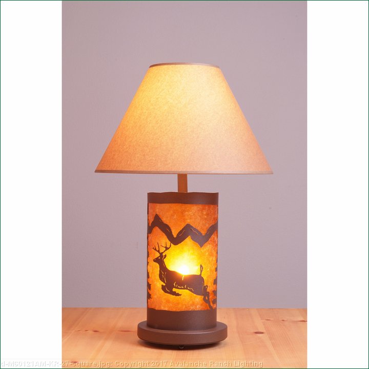 The Cascade Table Lamp - Valley Deer stands about 29 inches tall and features our exclusive deer metal art on the front and a spruce tree on the back of the lamp. Spruce trees are also on each side. It has a round base with a shade material choice between Almond or Amber mica. The upper socket also has a 3-way switch, so that you can have just the base lit, just the upper lamp lit, or both lit. Lampshade (Item #730-KR) is sold separately. This rustic lamp is one of our most popular styles and will bring a rustic decorative touch to any log home, cabin or northwood lodge-themed room.