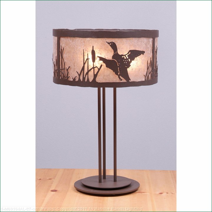 The Kincaid Drum Desk Lamp - Loon features our exclusive loon and cattails metal art in three sections and all around the drum lampshade. The lampshade measures 17 inches in diameter by 8.5 inches tall, is made of heavy gauge steel and inside has a mica diffuser with a choice of either Almond or Amber. It has a simple stand with a round base and three molded vinyl feet on the bottom to protect the surface of the table and a dimmer switch. This rustic desk lamp will bring a rustic decorative look and lighting to any log home, cabin or northwood lodge-themed room.