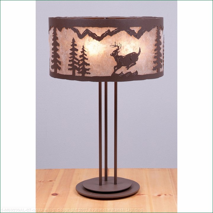 The Kincaid Drum Table Lamp - Mtn Deer features our exclusive deer and spruce tree metal art in three sections and all around the drum lampshade. The lampshade measures 19 inches in diameter by 9.5 inches tall, is made of heavy gauge steel and inside has a mica diffuser with a choice of either Almond or Amber. It has a simple stand with a round base and three molded vinyl feet on the bottom to protect the surface of the table and a dimmer switch. This rustic table lamp will bring a rustic decorative look and lighting to any log home, cabin or northwood lodge-themed room.