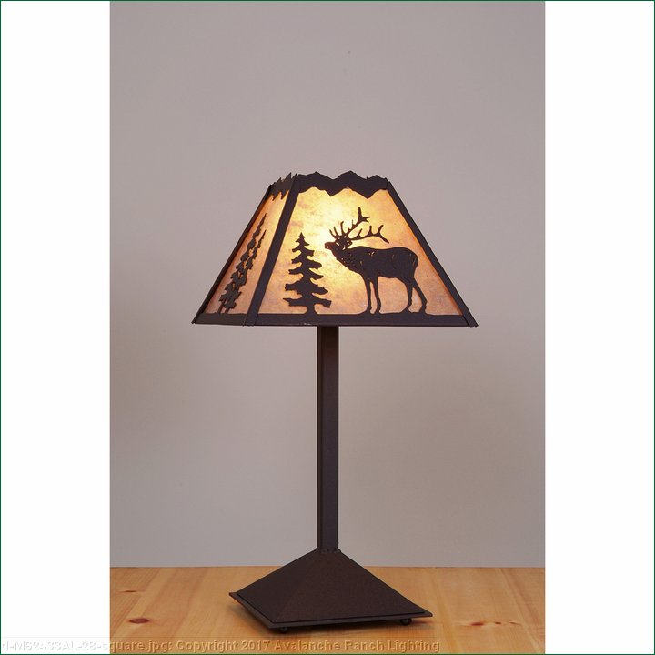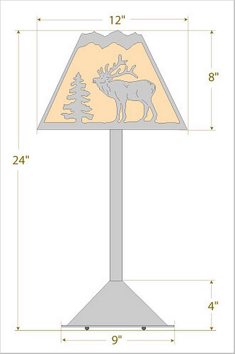 The Rocky Mtn Desk Lamp - Mtn Elk features a 12in. wide by 8in. tall lampshade frame with our exclusive elk metal artwork on the front two panels, and spruce trees on the sides. The lamp is made of heavy gauge steel, and has a diffuser choice between Almond or Amber mica. The light features a simple stand with a square base, four molded vinyl feet on the bottom to protect the table surface, and a three-way switch built into the socket. This desk lamp will bring rustic, decorative lighting to any log home, cabin or northwood lodge-themed room.