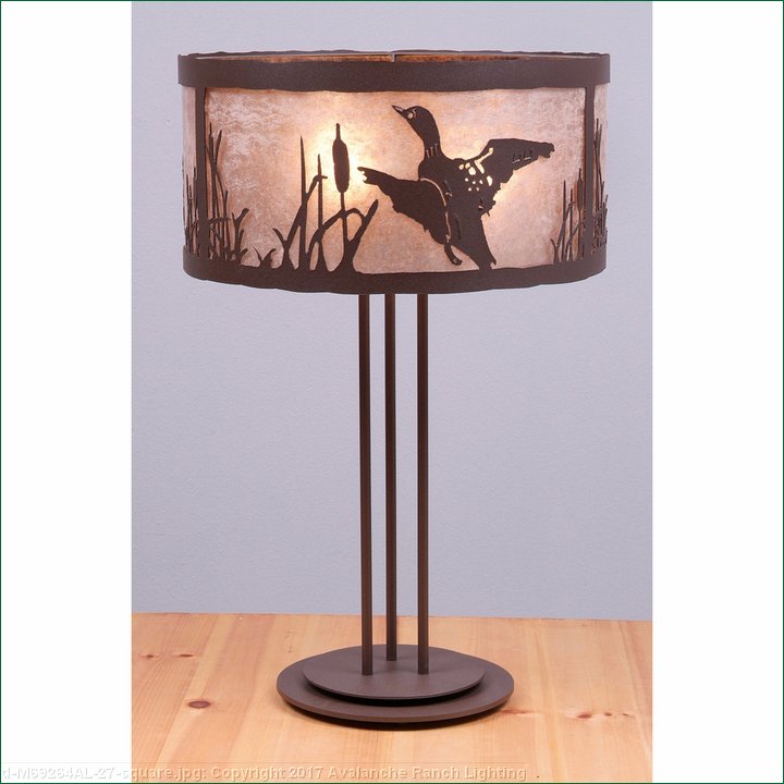 The Kincaid Drum Table Lamp - Loon features our exclusive loon and cattails metal art in three sections and all around the drum lampshade. The lampshade measures 19 inches in diameter by 9.5 inches tall, is made of heavy gauge steel and inside has a mica diffuser with a choice of either Almond or Amber. It has a simple stand with a round base and three molded vinyl feet on the bottom to protect the surface of the table and a dimmer switch. This rustic table lamp will bring a rustic decorative look and lighting to any log home, cabin or northwood lodge-themed room.
