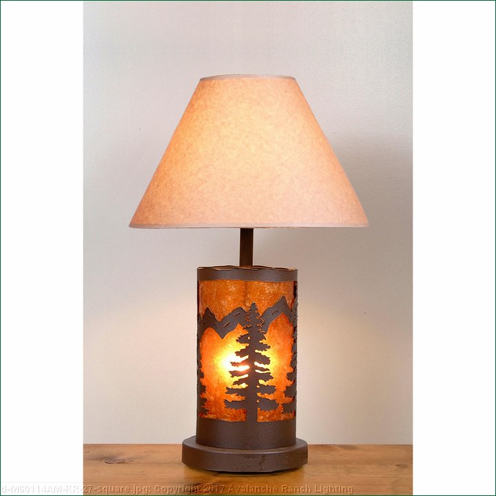The Cascade Table Lamp - Spruce Tree stands about 29 inches tall and features a spruce tree on the front and back of the lamp and spruce trees on each side. It has a round base with a shade material choice between Almond or Amber mica. The upper socket also has a 3-way switch, so that you can have just the base lit, just the upper lamp lit, or both lit. Lampshade (Item #730-KR) is sold separately. This rustic table lamp is one of our most popular styles and will bring a rustic decorative touch to any log home, cabin or northwood lodge-themed room.