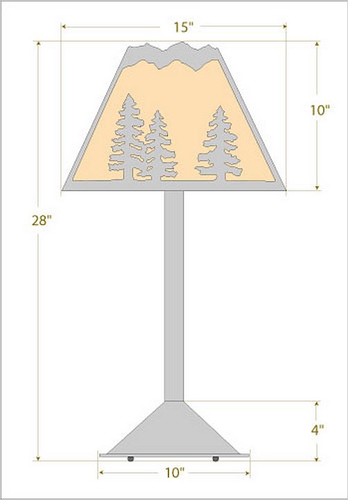 The Rocky Mtn Table Lamp - Spruce Tree features a 15in. wide by 10in. tall lampshade frame with our exclusive spruce tree metal artwork on all four panels. The lamp is made of heavy gauge steel, and has a diffuser choice between Almond or Amber mica. The light features a simple stand with a square base, four molded vinyl feet on the bottom to protect the table surface, and a three-way switch built into the socket. This table lamp will bring rustic, decorative lighting to any log home, cabin or northwood lodge-themed room.