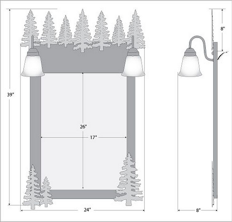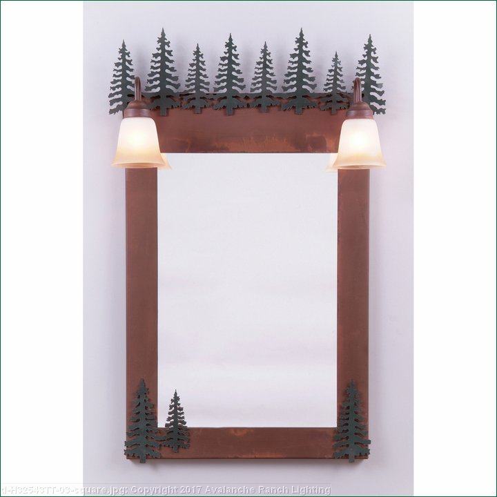 The Wasatch Mirror Frame with Lights - Cedar features cedar trees. Here we have taken our popular Wasatch Bath light and added a mirror frame for use in the bathroom or entry-way. Offered with a choice of four different styles and colors of glass globes, this fixture gives abundant light and rustic character to any bathroom.