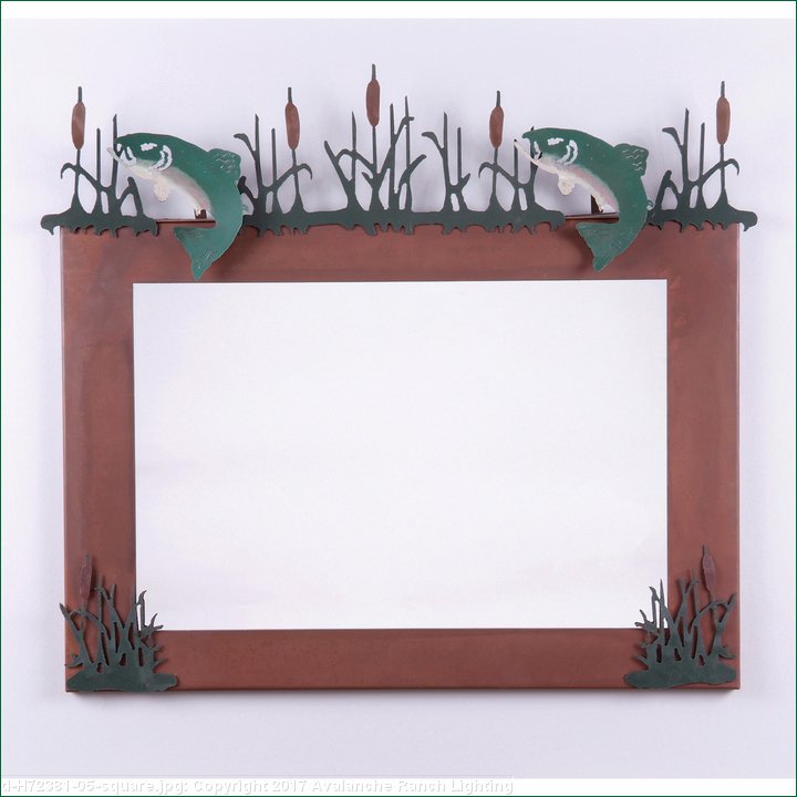 The Wasatch Horizontal Mirror Frame - Trout features a handpainted trout image jumping out of a cattails. Here we have taken our popular Wasatch Bath Mirror and removed the lamping.