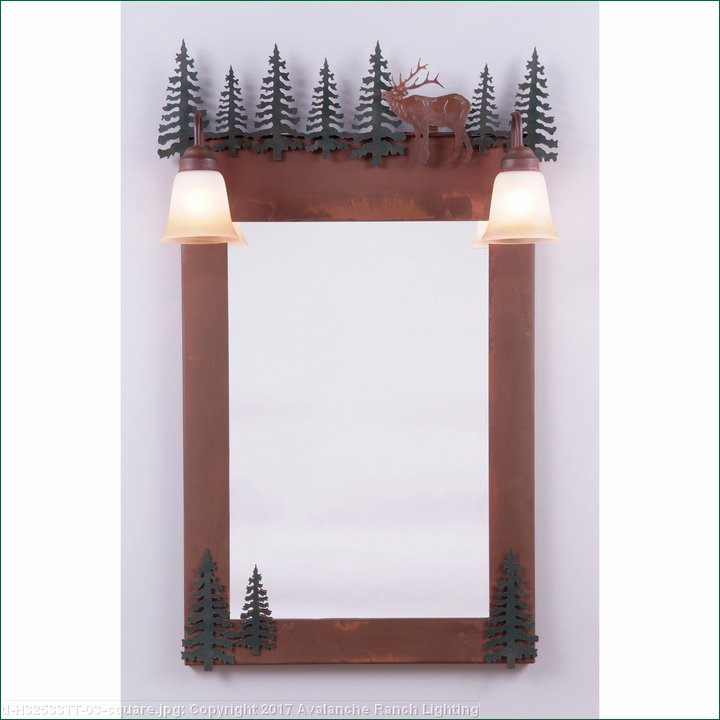 The Wasatch Mirror Frame with Lights - Mtn Elk features a elk with cedar trees. Here we have taken our popular Wasatch Bath light and added a mirror frame for use in the bathroom or entry-way. Offered with a choice of four different styles and colors of glass globes, this fixture gives abundant light and rustic character to any bathroom.