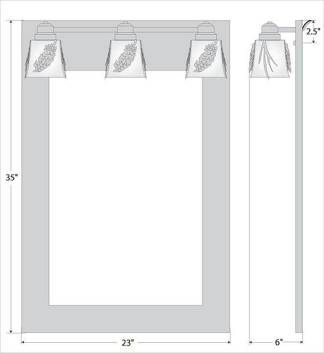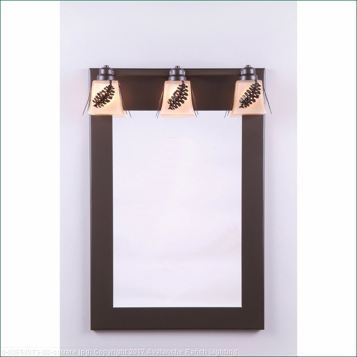 The Woodland Mirror Frame with Lights - Spruce Cone features a mirror frame and three pieces of square mission style glass and 3D spruce cone designs surrounding the glass. Choice of glass color between Frost Clear and Tea-Stained. The lighting provided by this item allows the mirror to be hung in even the dimmest areas of any home, while also creating a stylish rustic contemporary atmosphere.