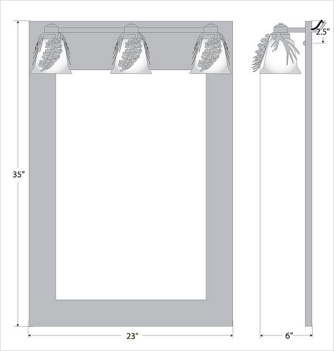 The Sienna Mirror Frame with Lights - Spruce Cone features a mirror frame and three pieces of glass and 3D spruce cone designs surrounding the glass. Choice of six different styles of glass. The lighting provided by this item allows the mirror to be hung in even the dimmest areas of any home, while also creating a stylish rustic contemporary atmosphere.