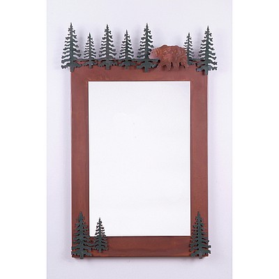 The Wasatch Vertical Mirror Frame - Bear features a bear with cedar trees. Here we have taken our popular Wasatch Bath Mirror and removed the lamping.