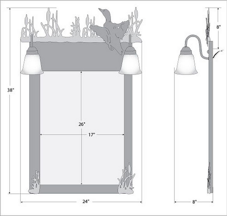 The Wasatch Mirror Frame with Lights - Loon features a loon with cattails. Here we have taken our popular Wasatch Bath light and added a mirror frame for use in the bathroom or entry-way. Offered with a choice of four different styles and colors of glass globes, this fixture gives abundant light and rustic character to any bathroom.