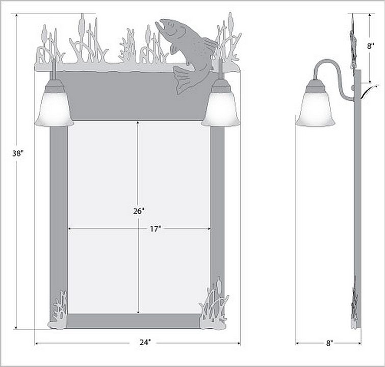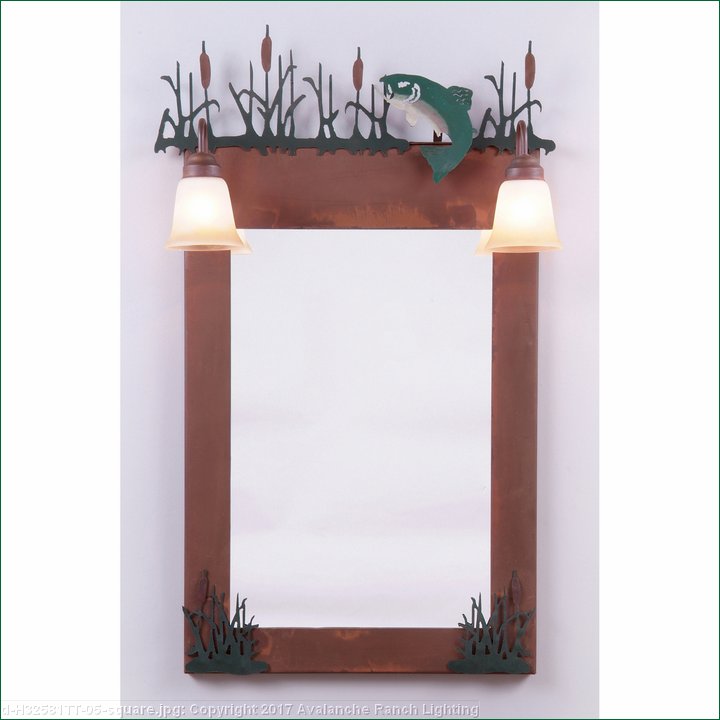 The Wasatch Mirror Frame with Lights - Trout features a handpainted trout image jumping out of a cattails. Here we have taken our popular Wasatch Bath light and added a mirror frame for use in the bathroom or entry-way. Offered with a choice of four different styles and colors of glass globes, this fixture gives abundant light and rustic character to any bathroom.