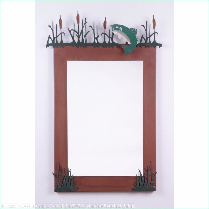The Wasatch Vertical Mirror Frame - Trout features a handpainted trout image jumping out of a cattails. Here we have taken our popular Wasatch Bath Mirror and removed the lamping.